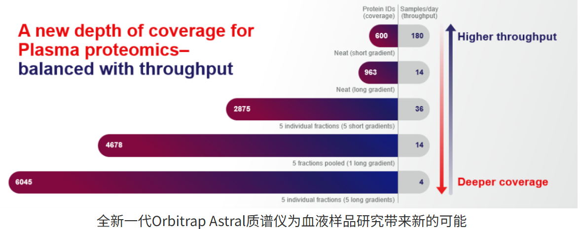 在蛋白质组学中,除了常规的细胞裂解液样品,解决具有极大的动态范围的血液样品也是巨大的挑战。在180个SPD(单日检测样品量)的通量下,未经高丰度去除的血浆样品可以达到约600个蛋白的鉴定水平,若需要更深的覆盖度,经处理后的5个fraction长梯度可达到超过6000个蛋白鉴定深度。而使用30min梯度分析经富集的血浆样品(5个fraction单独进样),DIA方法更是能够重复定量样品里的4500多种蛋白。全新一代Orbitrap Astral质谱仪鉴定深度,使得用户可以根据实验需要,在鉴定深度与通量之间寻求到平衡。