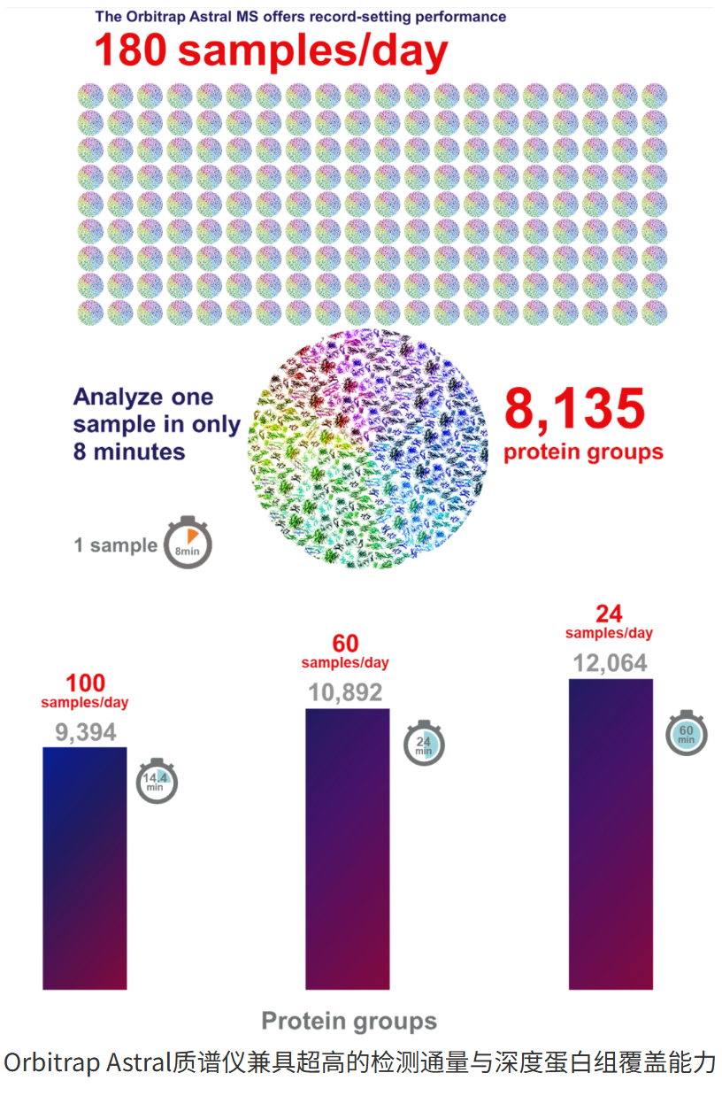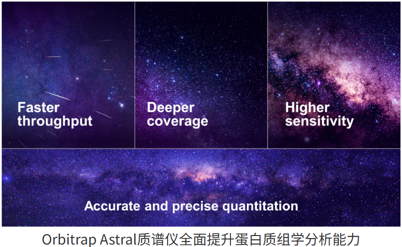 Orbitrap Astral质谱分析仪集四极杆质量分析仪、Orbitrap质量分析仪、Astral质量分析仪于一体,完美融合三大质量分析器,最大限度提升解决方案的性能和可用性,在检测通量、蛋白组覆盖深度、灵敏度及精准定量等多个维度表现出了其较强悍的性能。