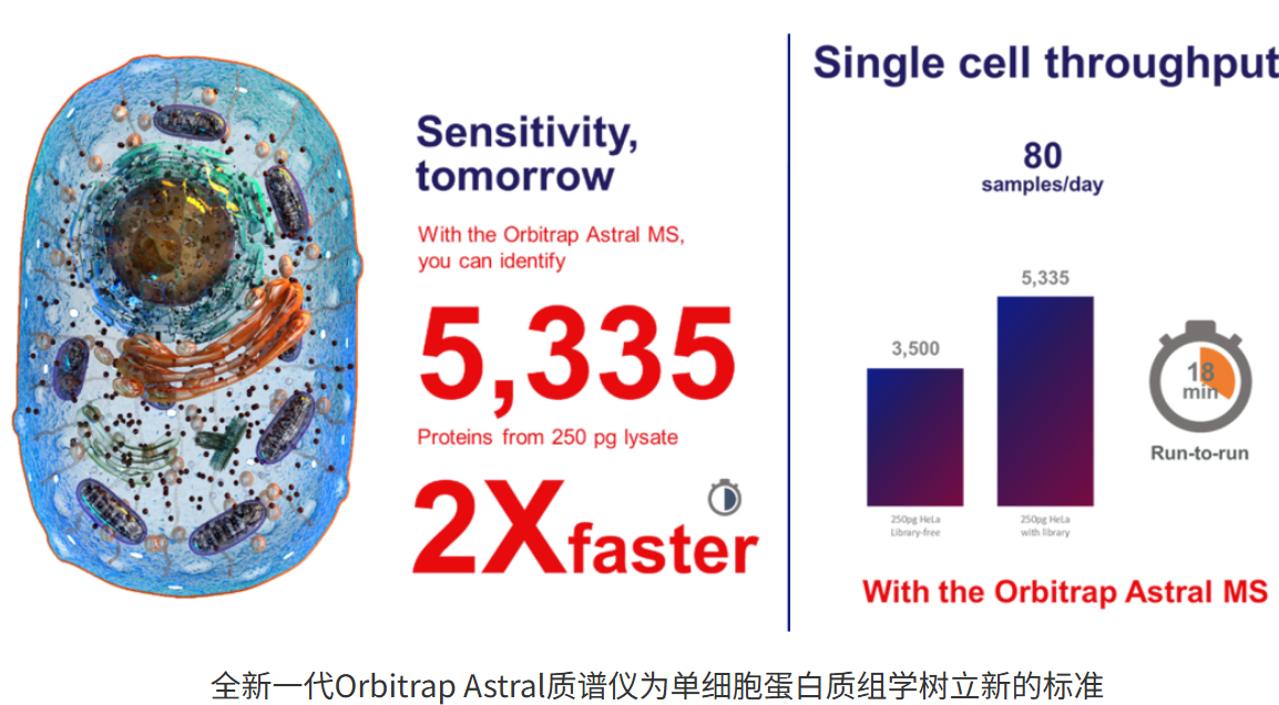 如今单细胞组学快速走进了人们的视野,要进行更深度、更高通量的单细胞蛋白质组学,对质谱的灵敏度提出了更高的要求。我们研究蛋白质组学,从来便是越深入越困难。而全新的Orbitrap Astral质谱仪,可以以较高的速率进行高动态范围的检测,同时兼具超高的灵敏度。在进行单细胞蛋白质组学的检测中,全新的Orbitrap Astral质谱使得我们可以以80个SPD的检测通量(18min梯度单针运行时间)的同时得到超过5000个蛋白的鉴定水平。这表明,使用全新的Orbitrap Astral质谱仪,我们可以在检测通量翻倍的同时,得到更高的蛋白鉴定能力,从而为单细胞蛋白质组学树立了新的标准。